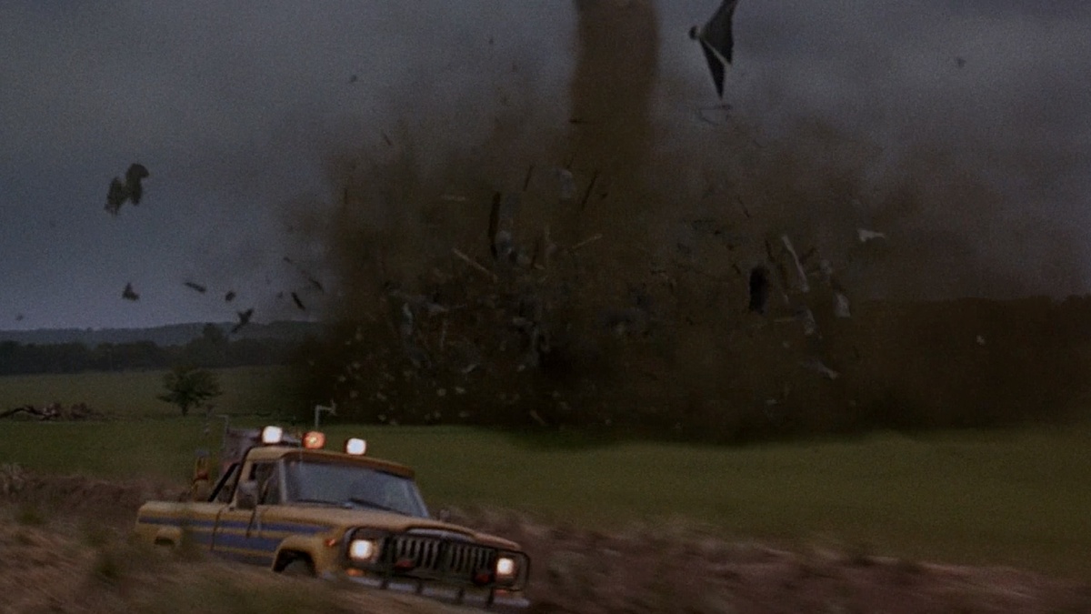 Смотришь и диву даешься, как они сделали такие спецэффекты в 1996 г. Просто моё почтение. Черное небо и звук ветра, который пробирает до мурашек и град. Мне даже показалось, что они добавили рык льва в звук появления смерча. Не знаю если будете пересматривать вслушайтесь. Может я и не прав. При чем смерч сломал прибор и Джо поругалась с Биллом и Мелисса всё это услышала. После приезда в мотель, на него обрушился новый торнадо, который разрушил уличный кинотеатр. Мелисса заявила, что уходит от Билла. Торнадо не остановился и разрушил всю Вакиту, как и дом тети Мэг.