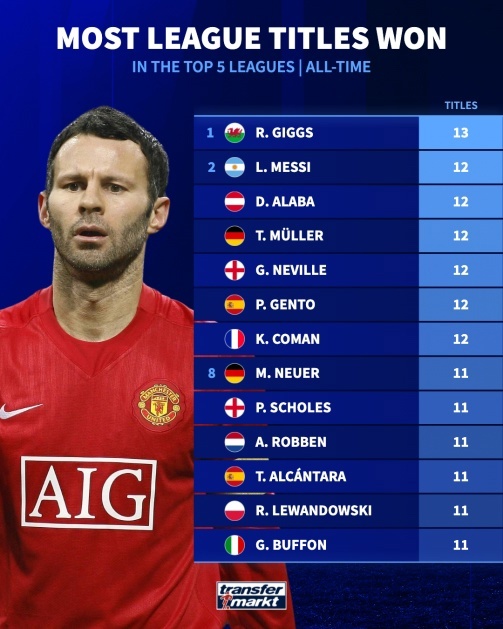 Портал Transfermarkt составил рейтинг игроков с наибольшим количеством чемпионских титулов, завоеванных в топовых европейских лигах – АПЛ, Ла Лиге, Серии А, Лиге 1 и Бундеслиге. Первую строчку занимает Райан Гиггз, за 21 год в «Манчестер Юнайтед» он рекордные 13 раз становился чемпионом Англии. Это лучший результат не только в Премьер-лиге, но и среди всех игроков из топ-5 лиг Европы. Если Гиггзи занял первое место единолично, то вторую строчку разделили шесть футболистов: Лионель Месси, Давид Алаба, Томас Мюллер, Гари Невилл, Пако Хенто и Кингсли Коман. У всех шестерых – по 12 чемпионских титулов. Уже в этом сезоне трое игроков смогут составить компанию Гиггзу на первой строчке. Мюллер и Коман в Бундеслиге идут к чемпионству с «Баварией», после 23-х туров оторвавшись от «Байера» на восемь очков. В Ла Лиге Алаба может оформить чемпионство с «Мадридом», но пока «сливочные» уступают «Барсе» по разнице мячей. Рекордсмены по чемпионским титулам в топ-5 лиг Европы А может, Гиггз и к концу с