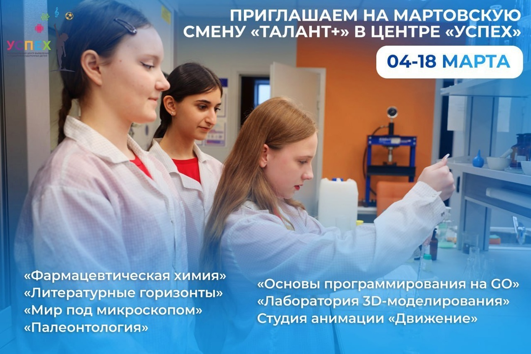 Смена пройдет в региональном центре выявления и поддержки одаренных детей «Успех» с 4 по 18 марта. Школьники смогут пройти обучение по одной из восьми дополнительных общеразвивающих программ: ✔️Лаборатория 3D-моделирования; ✔️Студия анимации «Движение»; ✔️Основы программирования на GO; ✔️Литературные горизонты; ✔️Мир под микроскопом; ✔️Палеонтология; ✔️Фармацевтическая химия. Для участников из муниципальных районов и городов Курской области будет организовано круглосуточное пребывание с проживанием в комфортном кампусе, обучением по общеобразовательным программам в лицее-интернате № 1 г. Курска и пятиразовым питанием.\