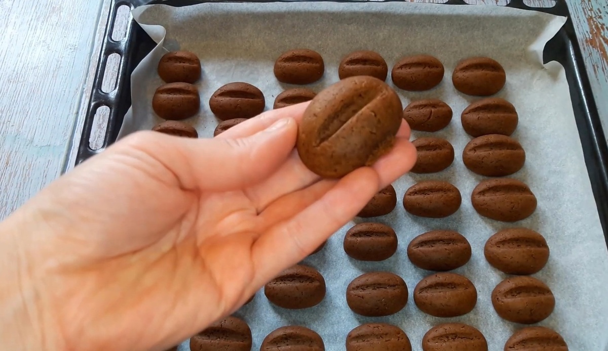 Ароматное и нежное печенье с насыщенным кофейным вкусом, которое по форме напоминает настоящие кофейные зёрна. Отличный вариант для любителей кофе! Мука – 200 г Крахмал (кукурузный или картофельный) – 50 г Какао-порошок – 20 г Сливочное масло (размягчённое) – 100 г Сахарная пудра – 80 г Яичный желток – 1 шт. Растворимый кофе – 2 ч. л. Горячая вода – 1 ст. л. Ванильный сахар – 1 ч. л. Разрыхлитель – ½ ч. л. Щепотка соли Растворимый кофе залить горячей водой и размешать до полного растворения. Оставить остывать. В миске соединить размягчённое сливочное масло, сахарную пудру и ванильный сахар. Взбивать миксером 2-3 минуты до кремовой консистенции. Добавить в масляную смесь яичный желток и остывший кофе, снова взбить до однородности. В отдельной миске соединить муку, крахмал, какао-порошок, разрыхлитель и соль. Перемешать. Постепенно вводить сухие ингредиенты в масляную смесь, замешивая мягкое тесто. Оно должно быть пластичным и не липнуть к рукам. Если тесто кажется слишком мягк