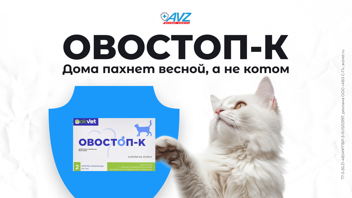 Erid: 2Vtzqx217Vg Реклама ООО "АВЗ С-П" ИНН: 5042113943 Весна – время преображений. Уходит снег, набухают почки, пробуждаются травы и… половые инстинкты у котиков. Если вы не планируете разведение, кота лучше кастрировать – это решит проблему половой охоты. Если питомец уже «загулял», а кастрировать не получается, скорректировать поведение можно с помощью препарата ОВОСТОП-К. В этой статье разберем, как он действует и как правильно его применять. Обычно первые признаки половой зрелости появляются к 8-10-месячному возрасту. Кот может громко мяукать, совершать попытки побега, проявлять агрессивность к людям и другим питомцам, делать садки на разнообразные предметы. Его моча приобретает характерный резкий запах, также кот может начать метить территорию. ОВОСТОП-К – это долгодействующий многокомпонентный препарат, в состав которого входят вещества, ответственные за снижение полового возбуждения и связанных с ним поведенческих реакций. ОВОСТОП-К действует на уровне гормональной и централь