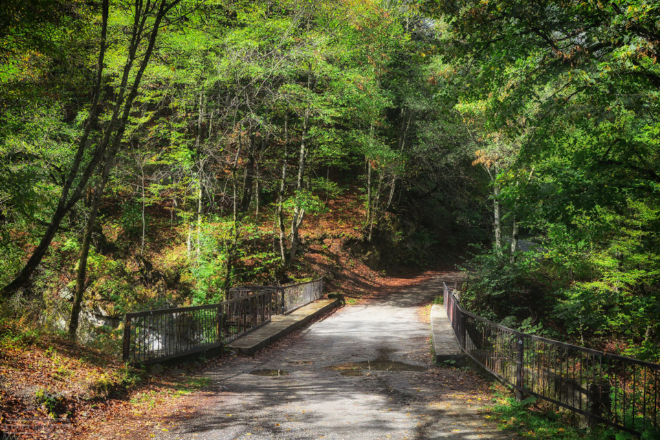 На пути до въезда в сам парк заглядываем к Чёртову мосту, он прямо у дороги. С виду – обычный мостик, но под ним – бездна с клокочущей рекой Урух.