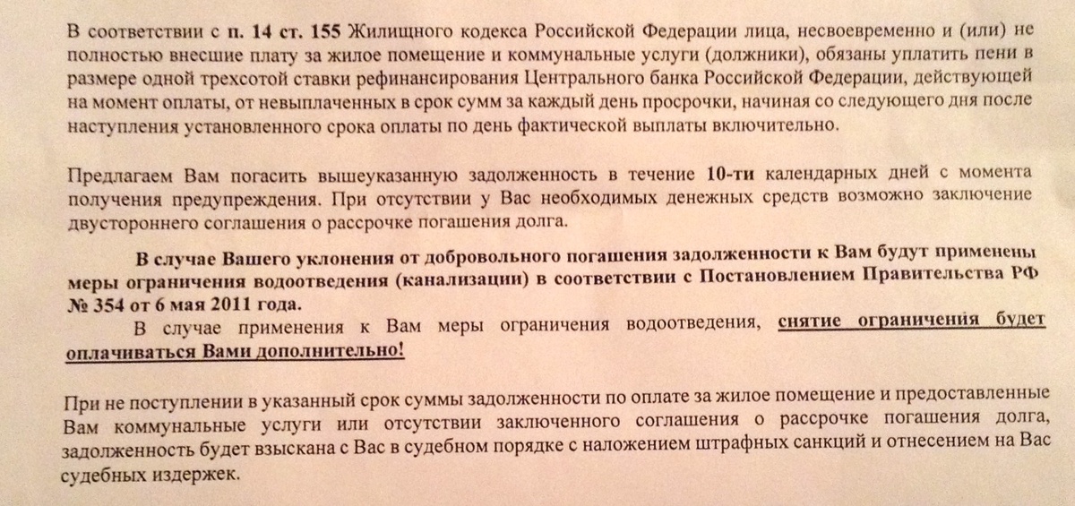 1 февраля в почтовом ящике обнаружили предупреждение от Жилищника с предложением погасить задолженность за 2 месяца в течение 10 календарных дней с момента получения, в противном случае угрожали, как это можно видеть на скане, перекрыть канализацию, судом, с оплатой всех судебных издержек, плюс оплата за демонтаж заглушки из канализационной трубы. Вместо предложения помощи людям, попавшим в тяжелую экономическую ситуацию по причине десятилетних санкций и непомерно высоких тарифов на ЖКХ и электричество вместе с налогами на жильё, которые повадились начислять мне дважды в год, они угрожают ещё больше испортить жизнь…