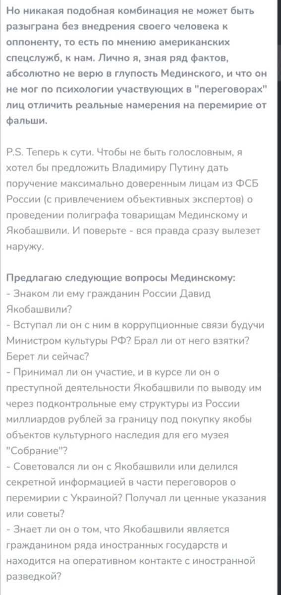 Напомню, в начале войны шли некие переговоры с Киевом о перемирии. С той стороны были намеки на перемирие, которые на деле оказались фарсом. Помните, наши уже чуть не под Киевом стояли и могли его взять, но им было приказано отступить - Кремль получил обещание, что все будет мирно. А в реальности противник выиграл время и подтянул помощь союзников, наемников, и мы получили настоящую кровопролитную войну вместо локальной спецоперации. Так вот почему-то в тех сомнительных и подозрительных переговорах участвовал Владимир Мединский (!), казалось бы, несведущий ни в военном деле, ни в дипломатии. Более того, некоторые считают, что он по образу тянет на "агента" чьих-то спецслужб или на "агента влияния" (читаю: "а не случайно ли он провалил те переговоры?", "Не смог понять, что был фарс?", "Так легко обвели вокруг пальца?", "или "в темную" использовали?"). А влияние у него большое, раз ему доверили после тех провальных переговоров, ставших словно подставой, еще и школьные учебники по