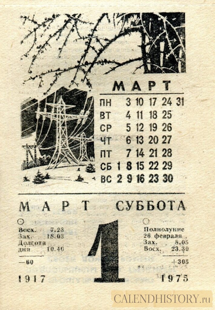 Итак, сегодня 1-го марта и у нас на календаре 1975-й год. Перед нами листок советского календаря для женщин. На календаре у нас суббота - 1 марта 1975-го года. *** Оборотную сторону листка этого календаря можно посмотреть у нас по ссылке на сайте. Другие листки советских календарей смотрите у нас на сайте - CALENDHISTORY.ru ПОСМОТРИТЕ ЕЩЁ ЛИСТКИ ОТРЫВНЫХ КАЛЕНДАРЕЙ: