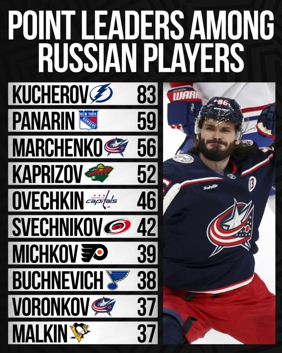 Русские лидеры по очкам в сезоне 2024–25: доминирование Кучерова и прорыв Марченко Сезон 2024–25 в НХЛ продолжает радовать болельщиков яркой игрой российских хоккеистов. На данный момент лидером по набранным очкам среди россиян является Никита Кучеров, а в топе списка неожиданно оказался Кирилл Марченко. Рассмотрим подробнее выступления лучших российских бомбардиров этого сезона. Кучеров на пути к очередному бомбардирскому титулу Форвард «Тампы» Никита Кучеров показывает феноменальную игру, набрав уже 83 очка. Он продолжает быть главной движущей силой атак «Лайтнинг» и претендует не только на звание лучшего бомбардира среди россиян, но и на «Арт Росс Трофи». Панарин и его стабильность Артемий Панарин проводит еще один продуктивный сезон в составе «Рейнджерс», имея в активе 59 очков. Его умение раздавать передачи и находить партнёров в выгодных позициях делает его ключевым игроком Нью-Йорка. Прорыв Кирилла Марченко Неожиданностью стал успех Кирилла Марченко, который уже набрал 56