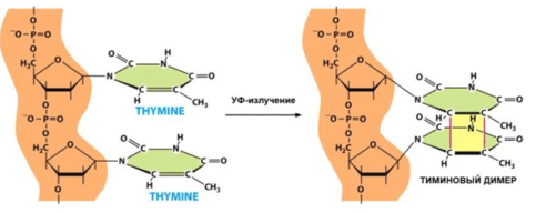 Сегодня у нас урок по мутации нашей ДНК. Вы наверное не знали, но ваша кожа каждый день подвергается мутациям под действием ультрафиолета. Обычного солнечного света. Когда происходит облучение светом Тиминовые основания ( В ДНК их всего четыре : Аденин (А), Гуанин (Г), Тимиин (Т), Цитозин(Ц)) между собой образуют химическую ( ковалентную ) связь Т-Т, которой в норме быть не должно. Потому что Тимин в норме соединен только с Аденином, как комплементарное основание. Эта связь Т-Т, возникшая под действием света, называется Тимииновым Димером. Грубо говоря это как в молнии на одежде два зубчика на одной стороне слипнутся . Что тогда произойдет ? Правильно, замок на молнии не сможет пройти это место. А в случае ДНК это еще приведет к тому, что будет нарушена репликация ДНК, а дочерние клетки будут нести уже мутировавшую ДНК с неправильным кодом, потому что ДИМЕР нарушает строку кода гена. В итоге это приведет к раку и человек умрет очень быстро. Однако в норме этого не происходит. Почему,