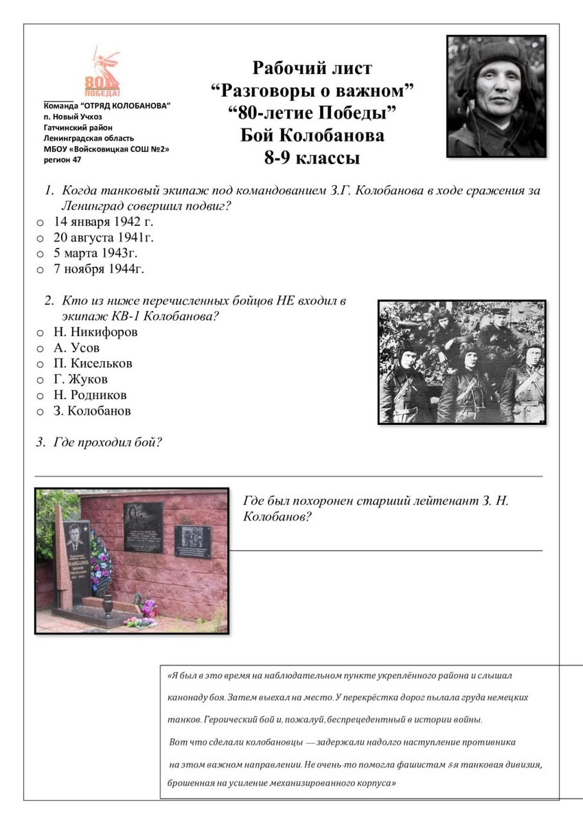 #Трек3. Цифровые технологии в сохранении памяти. Создание рабочего листа к занятию «Разговоры о важном» «80-летие Победы». Отряд Колобанова МБОУ «Войсковицкая СОШ №2» пос. Новый Учхоз Гатчинский район Ленинградской области Отряд Колобанова разработал рабочий лист к занятию «Разговоры о важном» «80-летие Победы» в соответствии с региональным компонентом. Вопросы о нашем знаменитом танковом бое и его героическом экипаже #80ДобрыйДелКПобеде #ФорумКлассныхРуководителей #Сферум80ДобрыхДел