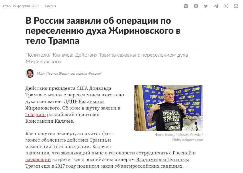 Шутки говорите.. Ню ню.. не совсем. Во первых программа воплощения Дональда Трампа пересчитана по постоянной 112 и делителю 8. Он скажем так..теперь в мышлении несколько "заглядывает в завтрашний день", а также предвзято относится к собственным структурам власти и компаниям. Но в Америке это давно и жизненно необходимо. Это у него еще ментал недостаточно перестроится успел. Со своей прежней программой он бы скорее устроил общемировую войну, нежели привел бы дело к миру. И наконец - при изменении вариативности программ переназначается и куратор воплощенца :).. И новым куратором (хоть и не круглосуточным) стал покойный Владимир Вольфович. Конечно это не реинкарнация...скорее переназначение духа-куратора-программиста, а не переселение или подселение.. с функцией дежурного алхима-санитара :). При том что сам Вольфыч хоть и закончил прохождение интенсивного очищения в Чистилище, но все равно бывает там в так сказать "дневном стационаре". Еще не до конца восстановился. Так и существует.. В о