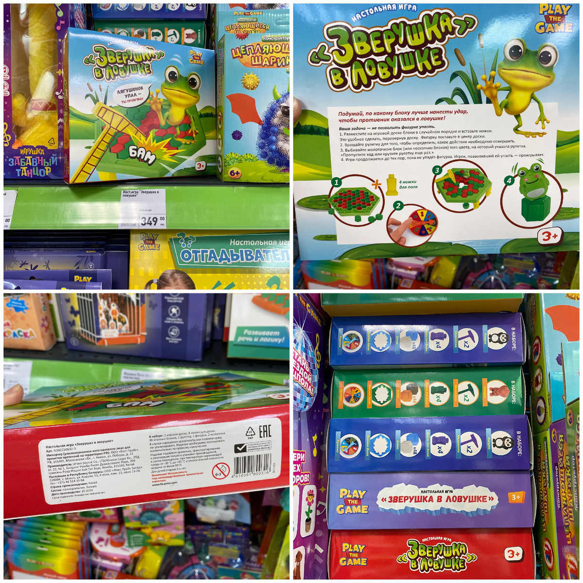 Настольная игра "Зверушка в ловушке" стоимостью 349 рублей. В наборе: 1 игровая доска, 4 ножки для доски, 48 игровых блоков, 1 рулетка, 1 фигурка, 2 молоточка. Состав: полипропилен, бумага. Страна изготовления Китай. В магазине 3 варианта.