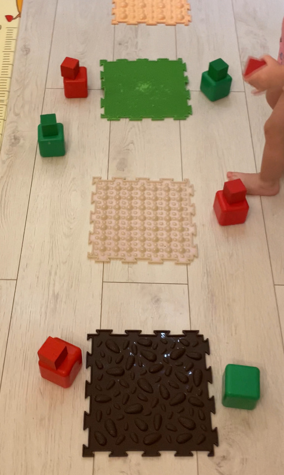 3) рассаживаем фигурки животных на кубики («поставь жирафа на синий кубик» и т.д) Вместо фигурок можем задействовать помпоны, пластелин и всё, что есть разноцветного под рукой (даже носки, например😊)