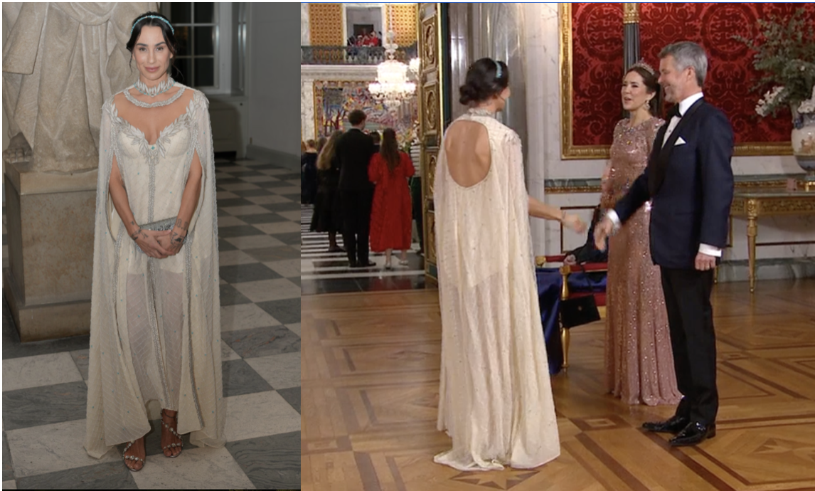 Певица Медина, очень известная в Дании (а вы её знаете?) выбрала наряд в эллинском стиле - хитон, ниспадающий красивыми складками вдоль тела. Вот только ткань она выбрала прозрачную, поэтому под платьем виден корсет, Вид такой, как будто дама стоит перед королем в трусах: