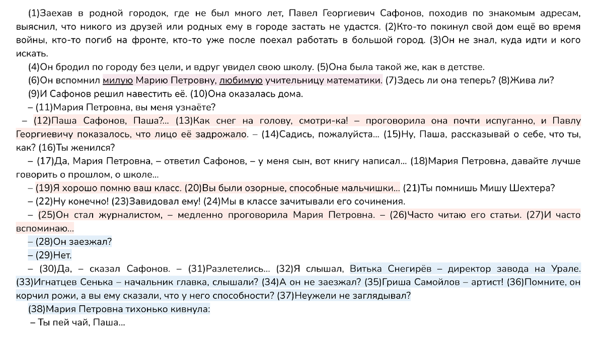 Так, в предложениях 6, 58-60 автор отмечает, что для Павла Георгиевича и для других его одноклассников Мария Петровна была «милой», «любимой» учительницей математики. В жизни самого Сафонова она тоже сыграла большую роль. На вопрос о том, есть ли «хоть капелька» её доли в его успехе, герой в замешательстве отвечает: «Если бы не вы!..». Становится ясно, что Мария Петровна была добрым и неравнодушным педагогом, который многому научил и Сафонова, и его одноклассников.