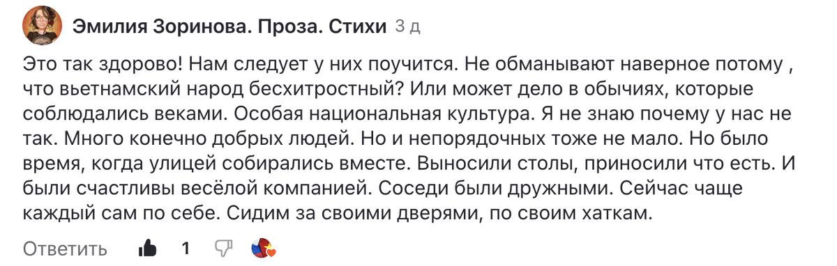 В прошлой статье из цикла про привычки вьетнамцев я задала своим читателям вопрос: почему при такой доброте и наивной простоте вьетнамцев никто не обманывает? По сути, в черновиках у меня уже была заготовка статьи. Но меня очень удивил ответ-комментарий блогера и моей подруги детства, автора канала Эмилия Зоринова. Проза. Стихи, потому что она достаточно точно воспроизвела мои мысли. Приведу здесь ее ответ целиком: Ну, а теперь мои соображения на этот счет. Они естественным образом вытекают из всего того, что я писала ранее. Нам, живущим в жестоком, безжалостном мире, может показаться, что вьетнамцы, с их привычкой помогать всем подряд, должны быть легкой мишенью для обмана. Но на практике это не так. Почему? Во Вьетнаме чужих людей практически нет. Даже если вы живете в городе, вокруг вас сформирована сеть друзей, родственников, соседей и знакомых. В деревнях вообще все знают друг друга с детства, а если появится обманщик, он быстро станет изгоем. В городах тоже социальные круги тес