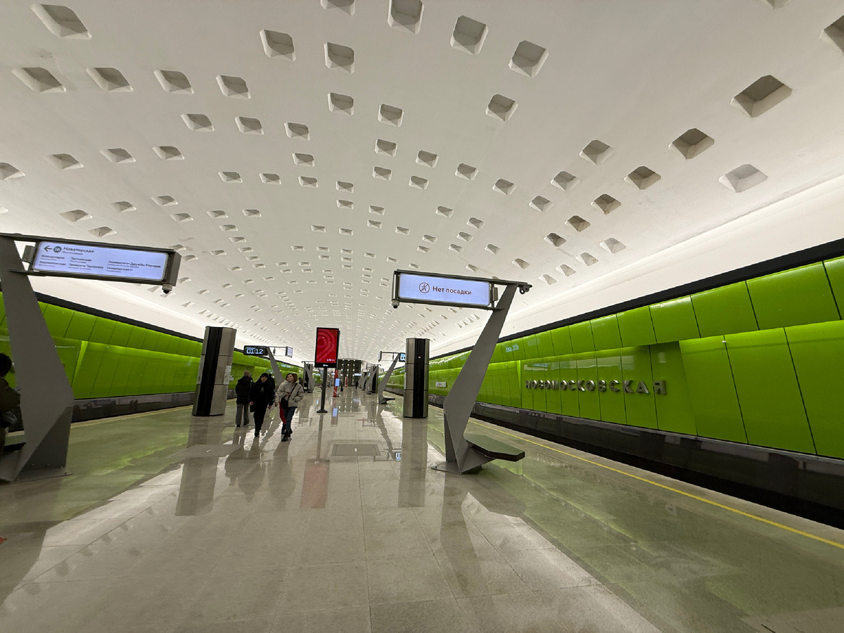В Москве метро строится с такой скоростью, что не только не успеваешь побывать на новых станциях, но даже и запомнить-то новые линии непросто. В 2024 году открылся второй участок Троицкой линии от «Новаторской» до «Новомосковской» с промежуточными станциями «Корниловская» и «Коммунарка». Я прокатилась и покажу вам, как сегодня выглядит Троицкая линия Московского метро. Мне показалось, что в основном станции построены по одному проекту, с колоннами в два ряда и высоким прямым потолком. Отличаются они, они, конечно, дизайном. Все станции оформлены в современном стиле новыми материалами: стекло, керамогранит, цветное стекло. Пока все новое и выглядит привлекательно, посмотрим, как все это будет жить. Начала я с Новомосковской, той, что раньше была Коммунаркой. Сводчатая станция с травянисто-зелеными стенами и белым потолком выглядит свежо и просторно, хотя и очень просто. Изюминка декора - необычные фонари с лавочками. Следующая станция - Коммунарка. Станция оформлена в строгой г
