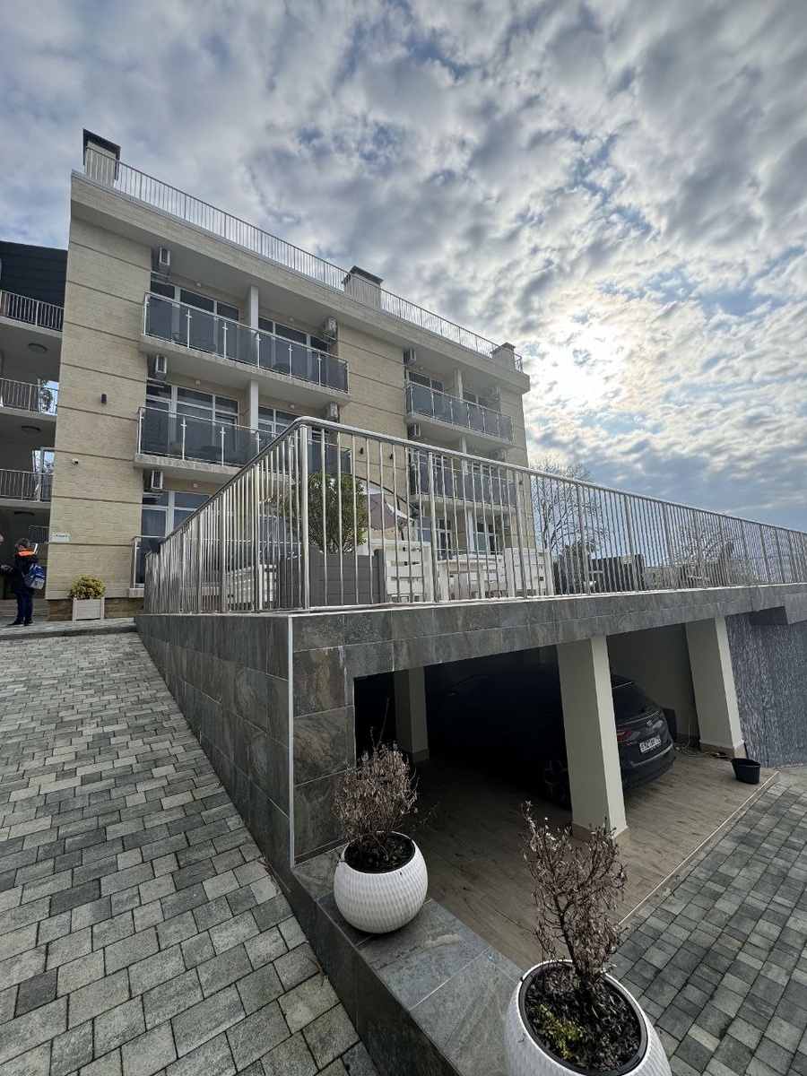 На самом отеле нет вывески с названием, мы минут 10 искали ресепшн. Он находится не в самом отеле, как мы привыкли, а в рядом стоящем домике перед парковкой. Обычно в таких будках сидит охрана))) Номера: Отель небольшой: три этажа, по восемь номеров на каждом. Достаточно новый и свежий ремонт. Есть два варианта заселения: стандарт с балконом и стандарт с террасой. Мы бронировали номер с балконом, но заселили нас в номер с террасой, что даже обрадовало. Площадь номера 24 кв. м. с мини-кухней, включает холодильник, чайник, микроволновку и обеденный стол. Небольшой набор посуды. Есть скудный косметический набор, халаты предоставляются, если вы бронируете баню. Тапочки на сайте заявлены, но по наличию их не было)) Очень удобный матрас, чему я была рада. Инфраструктура: Море близко, можно набл