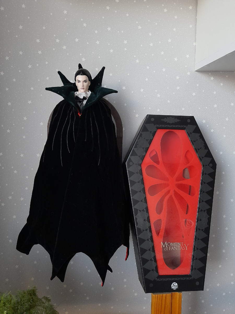 Жених прилетел на крыльях ночи и любви, меньше чем за две недели. Доставка али радует намного больше, чем озон глобал, хотя я часто вижу одних и тех же продавцов. Я мечтала об этом Адонисе с тех самых пор, как он вышел, но в голове стоял блок, что я не могу потратить 20 тысяч на куклу. В итоге я тратила ещё больше на аналоговых... Коробка в виде гроба. В комплекте идёт подставка, кольцо, скипетр, дополнительные жестовые кисти. Огромная бархатная накидка имитирует крылья летучей мыши, вышивка повторяет скелет этих самых крыльев. Это моя первая купольная покупка 2025 года, он выселил 26 кукол 🙈 Молодёжь моих полок сбежалась при виде хладнокровного графа. Девочки смотрели и зачитывались сумерками, они знают, что лучше парня, чем вампир не придумать! По сравнению с кеном, тело конечно мощнее, тяжелее, мускулистее. Поэтому на одной полке с барбиобразными ему лучше не стоять. Поппи приняла Дракулу холодно. Сказать что она в шоке- ничего не сказать. Она уже не в том возрасте, чтобы иска