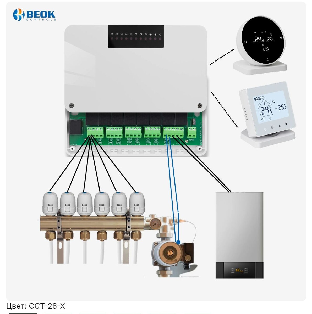 Beok выпустил обновление модели беспроводного концентратора для теплого пола Модель CCT-28-X Характеристики. Размеры. С концентратором может связываться две модели термостатов. Индикация на концентраторе. О Проверьте номера на плате и индикацию на лампочках корпуса при первом включении. На фото явное противоречие в номерах и линиях связи Описание индикации. Заявлено расстояние 30м от концентратора до термостата.с учётом перекрытий. Схема подключения В комплекте к концентратору предлагаются две модели термостата с подключением по 433 МГц И Обе модели термостатов связывается с приложением через wi-fi. Гистерезис заявлен 0,5 градуса. Питание моделей термостата. И Модели выпускаются более четырех лет и продавались как термостаты для котлов в комплекте с приемником на 433 мГц. В отзывах за 2023 и начала 2024 г часто встречалась ситуация пропадания связи с приемником при перезагрузке по сети 220 не рекомендую покупать данную модель. при отключении электричества, с его последующи