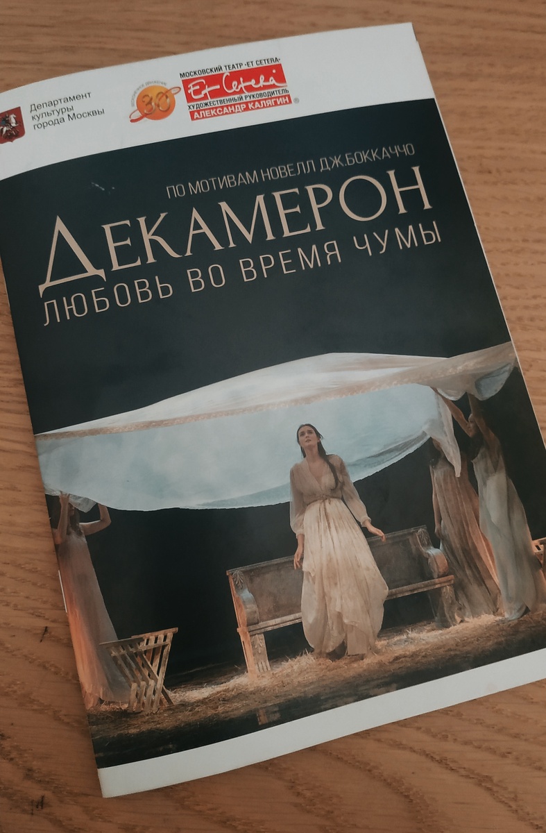 В последний день зимы мы с Элен запланировали сходить в театр. Покупку билетов и выбор спектакля взяла на себя я. Выбор пал на театр Et cetera под руководством Александра Калягина. Сначала я думала сходить на спектакль "Ревизор" непосредственно с Калягиным, но билетов в партер уже не было. Я повздыхала и решила: "Да ну ладно! Возьму на какую-нибудь вечную классику" . Взгляд упал на "Декамерон любовь во время чумы" по мотивам новелл Боккаччо возрастной ценз 16+. "Отлично" решила я "мы с Элен дамы совершеннолетние, классика вечная, дайте два билета!"