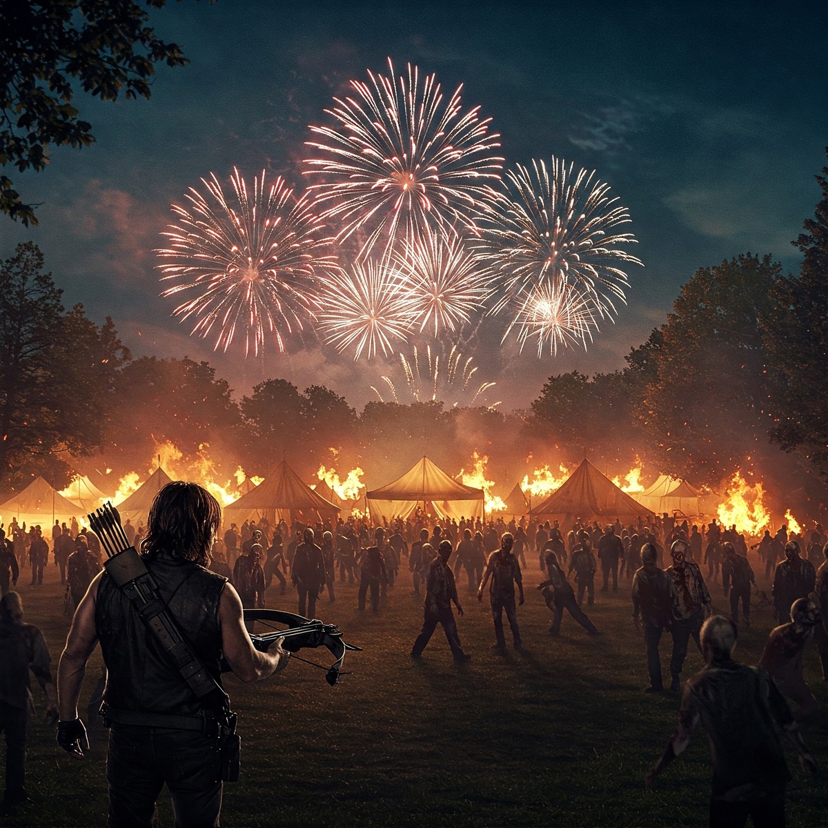 Последний рубеж: Выжить среди мёртвых - 8 часть(The Walking Dead: Survival Instinct). Дэрил, прибыв в Лемон Хилл, оказался в эпицентре катастрофы, где летний фестиваль, обещавший радость и единение, превратился в смертельную ловушку. Полуденное солнце палило нещадно, отражаясь от раскаленного асфальта, а в воздухе витал запах пороха от фейерверков и гниющей плоти ходячих. Толпы выживших, еще недавно смеявшихся и запускавших в небо цветные вспышки, теперь кричали от ужаса, пытаясь спастись от надвигающейся орды. Фейерверки, вместо того чтобы стать символом праздника, сыграли роль приманки — их громкие хлопки и яркие вспышки действовали на зомби как магнит, пробуждая их инстинкты. Когда первые ракеты осветили небо, напряжение в городе достигло предела. Дэрил, опытный выживальщик, заметил, как ходячие, до того беспорядочно бродившие по окраинам, начали стекаться к центру Лемон Хилла. Военные, пытавшиеся организовать оборону, пали под натиском — их баррикады из перевернутых машин и мешков
