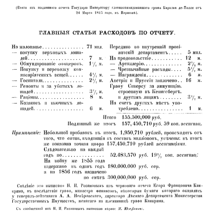 Доказав в "особо сделанном примечании", что эта сумма Военному министерству не принадлежала, а напротив от него надобно было получить Государственному казначейству столько же, т. е. 70 т. рублей для выдачи их на высочайше предназначенный расход, и что следовательно военным департаментам отпущено более назначенного годового размера до 140 т. рублей, я удержал эту сумму при окончательном, за 1821 год, отпуске денег.