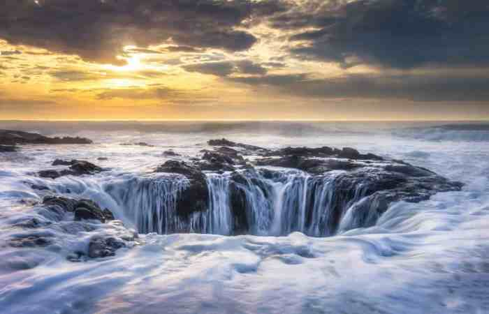 Исследования показали, что колодец Тора, когда-то считавшийся одной из величайших загадок Орегона - естественное образование, имеющее глубину чуть более шести метров. Он представляет собой чашеобразную воронку, высеченную в грубой базальтовой береговой линии, и его функция довольно проста.
