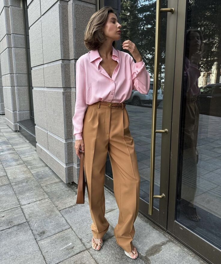 - С классическими брюками: Прямые брюки с высокой талией — это идеальный вариант для создания строгого и стильного образа. Выбирайте модели из легких тканей, чтобы обеспечить комфорт в течение рабочего дня.