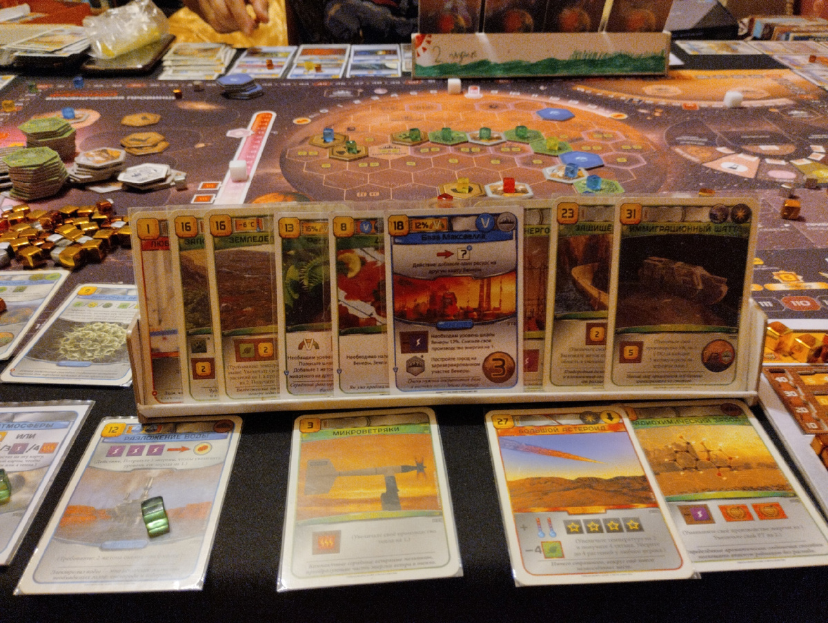 Великое и ушастое " Покорение Марса". Игра которая одновременно содержит глубину, азарт, расчёт, и при этом часто хорошо принимается новичками. Рецепт игры прост: берем элементы колодостроя, сдабриваем добычей ресурсов и приятным планшетом, добавляем красочное поле которое все одновременно застраиваем, убираем жесткое и обидное соперничество вместе с кингмейкингом и сломом. И вуаля шикарная игра на выходе. Куча возможностей в базовой игре, много дополнений, все очень вкусно. Единственное что не стоит её воспринимать как эталон баланса, доля рандома значительна (но регулируема) , но игра и не про то. Однозначно рекомендуется к ознакомлению. "И на Марсе яблони будут цвести" #настольныеигры #покорениемарса #