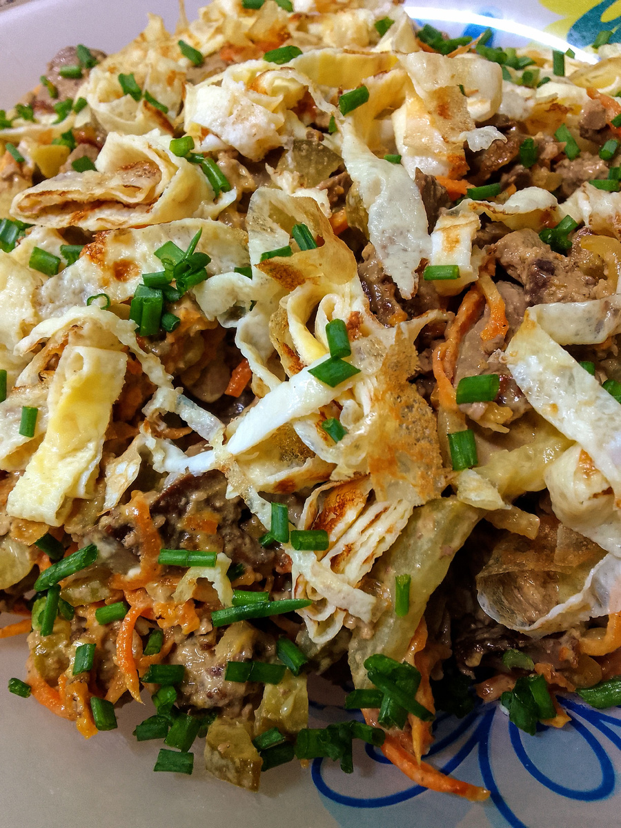 01.03.2025 Весна пришла, друзья! Здравствуйте! Вчера легла спать и завела будильник, ну а вдруг просплю, а у меня же гости и Мамулик приезжают, нужно готовиться к встрече. Проснулась пол девятого сама, без будильника, я очень ответственный человек 😇Накормила питомцев, себе сварила кофе и благополучно про него забыла, просто некогда было его пить. Первым делом начистила картошки, сверху уложила замаринованную вчера курицу и затолкала в духовку. Начала готовить салат из куриной печени. Девочки, делюсь рецептами) Рецепт: Печень куриная, вчера отварила. Обжарила морковку с луком потом нарезала печень туда отправила, всё перемешала. Маринованные огурчики нарезала соломкой, отправила к печени. Заправила майонезом. А сверху это блинчик яичный от другого салата остался, сейчас про него расскажу в следующем рецепте) Рецепт: Салат из крабовых палочек с колбасным подкопчённым сыром, очень легкий и простой и минимум ингредиентов! Первый слой, крабовые палочки, сверху сеточка из майонеза Второй