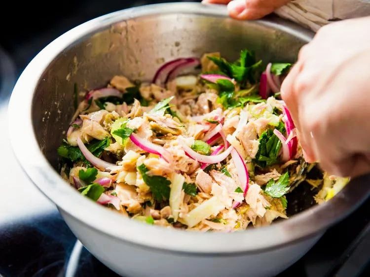 Этот сэндвич обладает массой достоинств - он вкусный, быстро готовится, не содержит майонез, хорошо разнообразит питание, подходит для угощения в большой компании. Многие люди очень любят майонез. Этот соус широко распространен, особенно в классических салатах с тунцом. Однако в этом рецепте мне импонирует средиземноморский подход к приготовлению блюда, когда тунец полит хорошим оливковым маслом и находится в одной компании с солеными каперсами, оливками и овощами, такими как сельдерей, фенхель и красный лук. Приступаем к готовке. 1/2 красной луковицы среднего размера, тонко нарезанной 1/4 стакана (60 мл) красного винного уксуса 560 грамм тунца, запеченного в масле, или 2 банки консервированного тунца в масле 1 стебель сельдерея, нарезанный тонкими ломтиками наискосок 1/4 средней луковицы фенхеля, очищенной от сердцевины и тонко нарезанной (можно не класть, а просто увеличить количество сельдерея) Горсть мелко нарезанной петрушки 2 столовые ложки очищенных соленых каперсов 1/4
