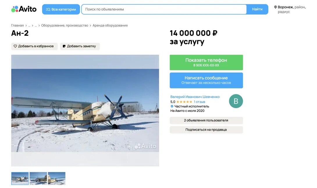 В Воронеже продают пассажирский самолет Ан-2. Не совсем обычное объявление появилось на днях на сайте «Авито». На него обратило внимание издание De Facto. За транспортное средство нынешний собственник запрашивает 14 миллионов рублей. Сообщается, что самолет был построен в 1989 году. Его состояние оценивается как хорошее. Трижды объект капитально ремонтировали. В основном воздушное судно задействовали под коммерческие перевозки. За последние годы это не первое подобное объявление о продаже летательных средств. В 2023-м, например, в городе выставили на продажу Ан-32 1988 года. Стоимость лота составила 16 млн рублей. В 2020 году воронежцам за 2 млн рублей предлагали легендарную «Катюшу». Тогда же на сайте объявлений появились предложения купить истребитель Миг-21. Фото – «Авито». Не пропустить важное в ДЗЕН 36ON