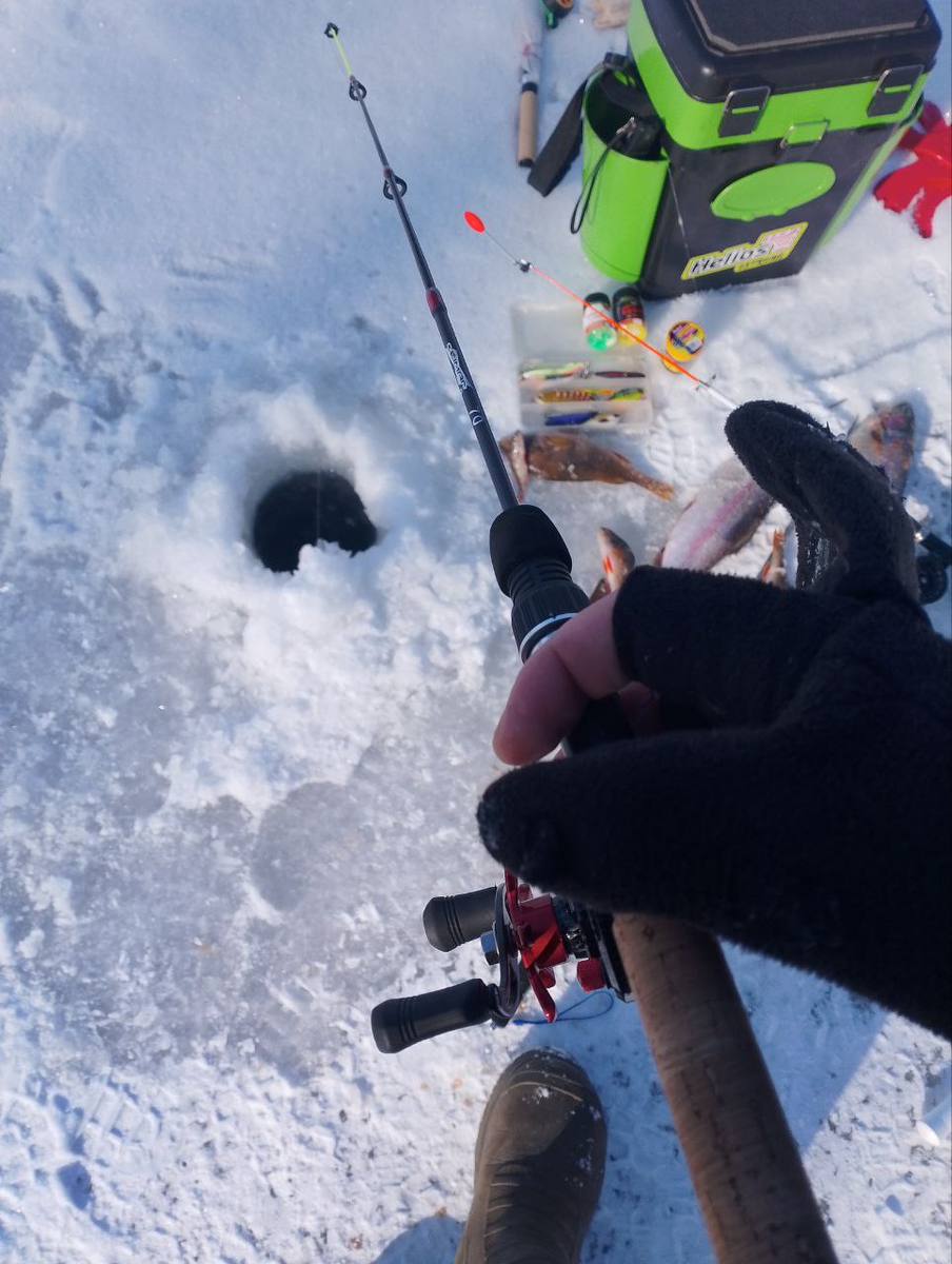 Для полноты эксперимента я протестировал зимний фидер в паре с зимним мультипликатором KDF Team Persista, сменив десяток вибов и балансиров. Впечатления вполне себе неплохие. Другое дело, что преимущества мультипликаторной катушки и тонкого плетёного шнура более полно раскрываются на больших водоёмах и соответствующих глубинах, а в моей сегодняшней локации максимальной “Марианской впадиной” была шестиметровая ямка, да и перемещался я не так много. К тому же щука была абсолютно пассивна (высокое давление, магнитные бури, да и на небе тучи), поэтому ощутить удар щуки или судака мне не довелось, а вибрации раттлинов и зигзаги балансиров передавались в руку отлично. Нельзя объять необъятное, так что я вернулся к варианту с катушкой Scope и более миниатюрными приманками.