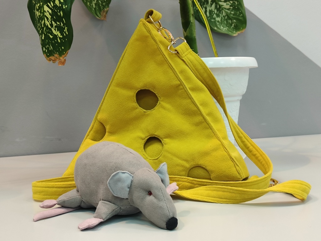 А если каждый день подмечать интересные идеи, можно дойти до самых невероятных форм, например, до «сырной сумки». Этот проект уже реализован. Но вот во время создания «дырочек» в голову и пришла мысль дополнить желтый аксессуар смелой деталью – мышкой.