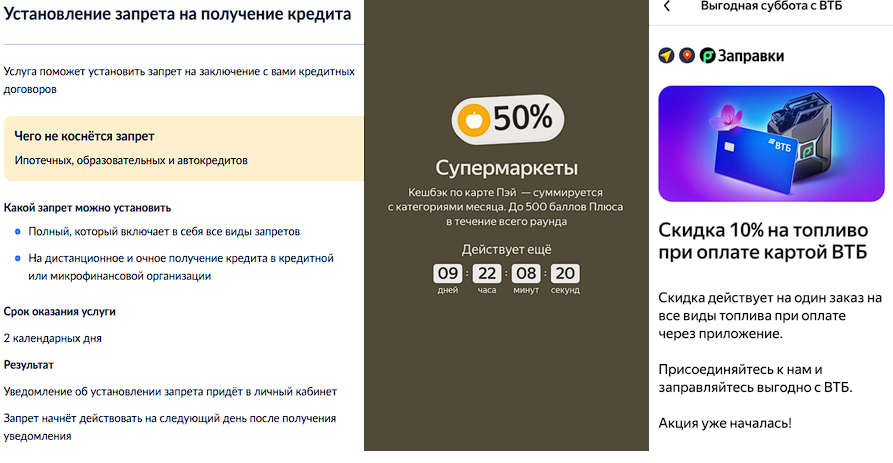 Сегодня крутим барабан в Яндексе. Из интересного как обычно 50% на Супермаркеты и 100% на кафе, рестораны Свои 50% я уже вытянула Вот и Сбер подтянулся. Выбираем категории и можно составлять список карт с кешбэком на месяц. Сегодня кроме 21% на Дикси за покупку от 2500 (лимит 550 б) Добавили 40% на Топливо в Городе (лимит 450 б) Можно заправиться со скидкой 10% на один заказ до 70л при оплате картой ВТБ Оплачивать нужно через приложение (Акция в разделе Скидки и акции Яндекс заправок) Для участия в акции, первые цифры карты должны быть в списке Правила акции С 1 марта можно оформить запрет на кредиты и займы через Госуслуги. Устанавливается запрет на потребительские кредиты и займы (не распространяется на ипотеку, автокредиты и образование, а так же уже оформленные). При оформлении, можно выбрать: ▪️Полный, который включает в себя все виды запретов ▪️На дистанционное и очное получение кредита в кредитной или микрофинансовой организации Снимается запрет так же через Госуслуги, но нужн