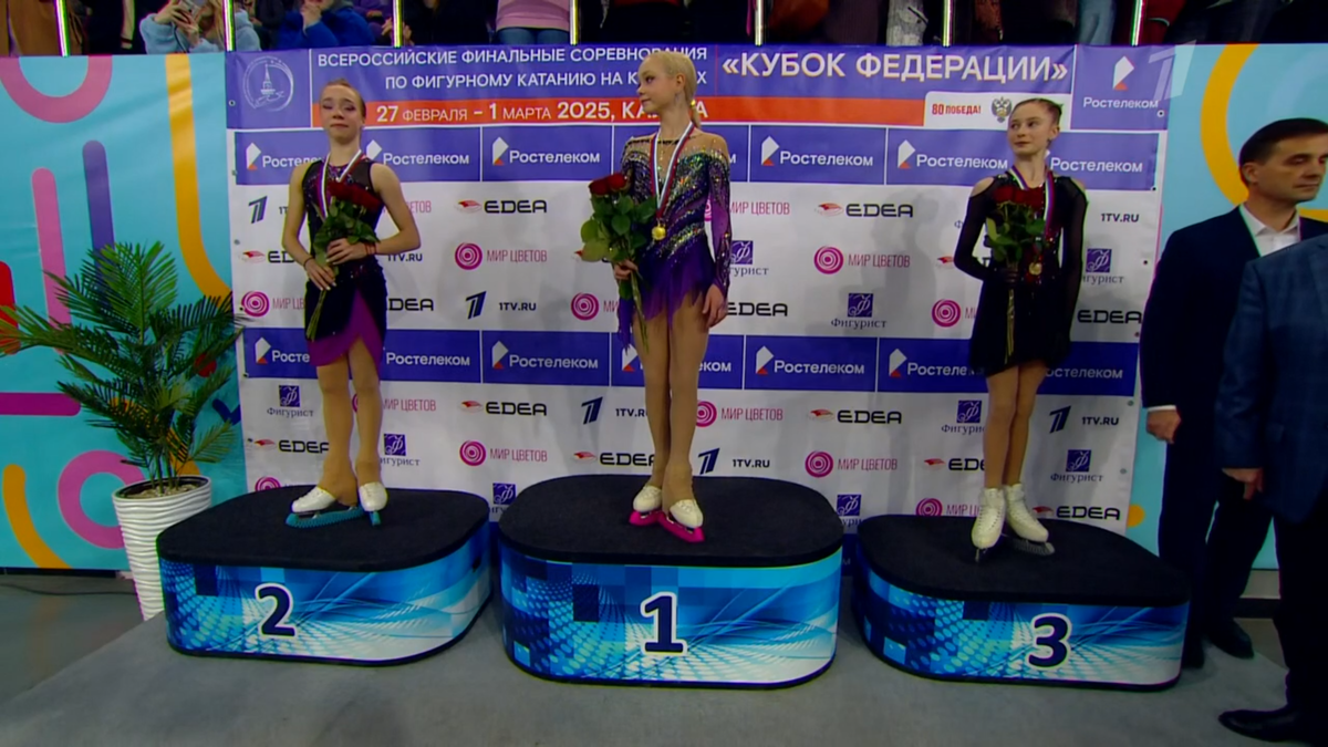 Агата Петрова. Тренер Татьяна Мишина. Да, видимая ошибка на тройном флипе не позволила ей обойти три квада Андреевой. Есть недокруты.