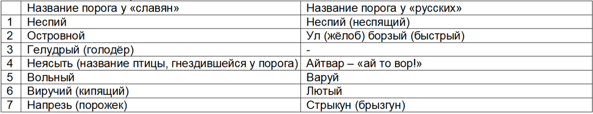 Историографам хорошо известно, что в своём сочинении "Об управлении Империей" византийский Император Константин Багрянородный (905-959) привёл названия 7-ми Днепровских порогов у «славян» и у «русских». Император в своём сочинении утверждал, что у "русских" и у "славян" пороги назывались по-разному. Это один из главнейших доводов сторонников "норманнской теории" происхождения государственности Руси. Даже Л.Н. Гумилёв, обращая внимание на этот факт, утверждал, что "русский" вариант названия порогов не понятен на современном русском языке. Однако, почему-то, ни Л.Н. Гумилёв, ни норманисты сами названия эти не приводили, а оригинал трактата Константина Багрянородного был крайне малодоступен широкой читательской аудитории в эпоху до Интернет. Казалось бы, чего проще? - привести "русские" названия порогов, показать, что они были шведские или норвежские и, тем самым, прекратить дискуссию на эту тему навсегда. Автор книги "Святослав" приводит эти названия: