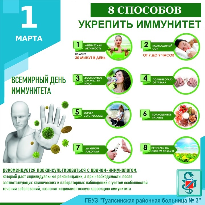 - употребляйте продукты, богатые витаминами; - пейте чистую воду; - старайтесь больше времени проводить на природе; - поддерживайте хорошую физическую форму: делайте утреннюю зарядку или пробежку; - постарайтесь избавиться от вредных привычек; - вовремя проходите вакцинацию; - избегайте стрессов, разрушительного действия таких психологических качеств как злость, ревность, зависть, агрессия. Проявлениями нарушений в работе иммунной системы служат частые простудные заболевания, частые головные боли, боли в суставах и мышцах, нарушения сна, увеличенные лимфоузлы. Для поддержания иммунитета рекомендуется проконсультироваться с врачом-иммунологом, который даст индивидуальные рекомендации, а при необходимости, после соответствующих клинических и лабораторных наблюдений с учетом особенностей течения заболеваний, назначит медикаментозную коррекцию иммунитета. Подробнее на нашем сайте: https://hosp23.ru/medevents/425-denimmuniteta.html