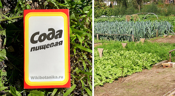 Находчивые дачники придумали несколько способов использования соды на своих участках. Чаще всего с помощью соды садоводы и огородники борются с вредителями и болезнями растений, а также пытаются уничтожить сорняки или раскислить почву. Сода против насекомых (муравьев, гусениц, проволочника, тли, долгоносика и слизней) На сегодняшний день существует немало готовых магазинных средств для борьбы с насекомыми-вредителями, однако многие дачники по-прежнему пользуются народными рецептами, в составе которых есть, в том числе, и сода. От муравьев. Чаще всего дачники используют соду в огороде как средство для борьбы с муравьями. Многие отмечают эффективность этого метода, хотя есть и те, кому он не помог. Существует несколько способов избавиться от муравьев с помощью пищевой соды. Во-первых, можно приготовить жидкий раствор. Рецепт простейший: пачку соды растворить в стандартном ведре воды (или, если нужно меньше готового средства, 2 столовые ложки в 2-х литрах). Этой смесью нужно полить муравейник, предварительно разворошив его. Для лучшего эффекта после применения содового раствора муравейник следует прикрыть плотным материалом или просто присыпать землей. Второй вариант еще проще — сухая сода. Пачку соды (чистую или в смеси с сахарной пудрой) высыпать на муравейник. Если соду ничем не разбавлять, муравьи покинут жилище, а если смешать с сахаром — насекомые непременно попробуют лакомство, которое станет для них ядом. [!] Опытные огородники отмечают, что содовый раствор уничтожает муравьев гораздо лучше сухого продукта, поскольку насекомые часто просто обходят порошок стороной, протаптывая новые тропинки.