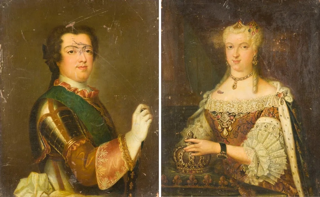 На одном германском аукционе выставлен на продажу пандан, то есть пара портретов, изображающих мужского и женского персонажей XVIII в. Мужской персонаж представлен в образе полководца в доспехах и с, как говорили в XVIII-начале XIX вв., «повелительным» жезлом. Женский персонаж запечатлен в образе монархини, имея горностаевую мантию на плечах и корону на подушке перед собой. При атрибуции личностей портретируемых и авторства портретов аукционеры следуют сведениям, содержащимся на прикрепленных к картинам этикетках: «Приписывается Антону фон Марону (8 января 1731 (Вена) – 3 марта 1808 (Рим)). Портрет Марии Терезии (эрцгерцогиня Австрии и королева Богемии и Венгрии) и императора Франца I Стефана (император Священной Римской империи германской нации)… Каждый подписан соответствующим образом на старой бумажной этикетке… Провенанс: частная коллекция в Вестфалии». Антон фон Марон был австрийским художником-портретистом высокого класса, известным в том числе своими изображениями членов династ