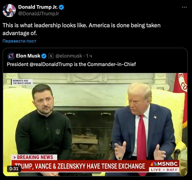 «То, что только что произошло в Овальном кабинете, было ничем иным, как замечательным событием. То, что началось с вопросов о гарантиях безопасности Украине для прекращения огня, превратилось в яростную перебранку между Трампом, Вэнсом и Зеленским. Трамп был в ярости, закончив словами: «Мы уполномочили вас быть крутым парнем... Либо вы заключаете сделку, либо мы уходим. У вас нет карт».