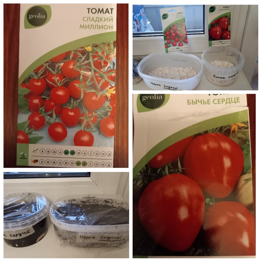 Сегодня 1 марта 2025 года. В этот первый день весны я посеяла семена томатов. Это черри сорт «Сладкий миллион» и крупноплодные томаты «Бычье сердце». Рекомендуемые производителем сроки посева, указанные на упаковке, от 1 марта до 15 марта. Пока я в выращивании овощей не особый специалист, поэтому принципиально не покупаю дорогие семена и редкие экзотические сорта. Ценовая категория этих семян до 30 рублей. Это в «Лемана Про» (бывший «Леруа Мерлен»). Эти томаты относятся к категории индетерминантных, то есть высокорослых. Преимущество таких сортов в том, что с одного растения можно получить много плодов, оно занимает меньше посадочной площади в теплице, поскольку растет в высоту. Но есть и недостатки. Растение требуется правильно формировать, подвязывать, удалять пасынки. Я хочу попробовать посадить разные сорта, а потом сравнить: урожайность, уход, вкус и пр. Я выбрала небольшие пластиковые емкости для каждого сорта. Чтобы не перепутать, я их подписала. На дно я насыпала яичную скорлуп