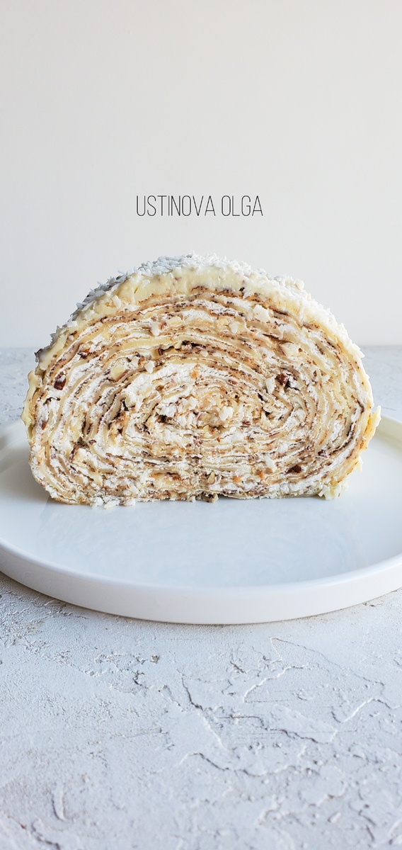 Блинный рулет "Рафаэлло" Тесто для блинчиков: 2шт - Яйцо 2ст.л - Сахара 1/2 ч.л - Соли 300гр - Кокосовое молоко или (сливки) 200гр - Муки 30гр - (3ст.л) растит масла 300мл - кипятка Кокосовый сироп - опционно В молоко добавить яйца, соль,сахар, взбить, добавить муку, все хорошо взбить венчиком. Кипяток влить в тесто, далее добавить растительное масло. Выпечь блинчики. Для рулета нужно 12-15 шт. Крем с маскарпоне: 250гр - Маскарпоне 200гр - Сливки 33-35 % 100гр - Сахарная пудра 30-40гр - Орехи миндаль 20-30гр - Косовая стружка Сливки взбить с сахарной пудрой до мягких пик, добавить маскарпоне, взбить до плотности. Сборка: Каждый блинчик смазать кремом посыпать кокосовой стружкой, уложить в нахлест, посыпать измельченным миндалём, по желанию можно посыпать вафельной крошкой. Свернуть в рулет, убрать в холодильник минимум на 4-8 часа. Глазурь Роше: 300гр - Белого шоколада 100гр Растительного масла без запаха 50-60гр Измельчённых орехов ,у меня миндаль 20гр - Кокосовая стружка Вафельная
