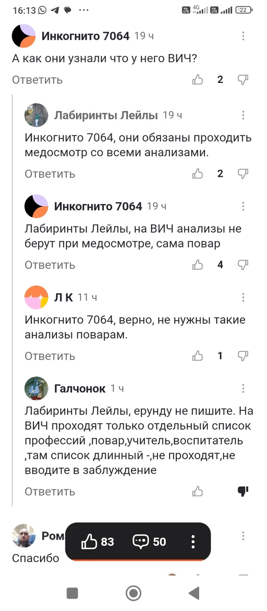 Привет, друзья! Тут вчера случайно мне лента подсунула статью про то, как один гордый собой ( Вич инфицированный) рассказывал о том, как к нему в палату положили мужчину, который потом рассказал о том, что являлся по специальности шеф-поваром. Так вот когда хозяева этого общепита узнали о том, что их шеф-повар является Вич- инфицированным, то его уволили. По словам автора, таких людей не надо было увольнять. Что они вокруг нас, что пусть работают и в больницах, и с детьми и в общепите. Ничего страшного а этом нет, это нормально. Это мы, дремучие люди "ссым в штаны" от того, что слышим, что рядом с нами работает "вичевый" - терминология автора сохранена. И ещё мне возражали о том, что ежегодное обследование на вич не проводится таким категориям, как повара. Короче, я адекватно высказалась в том топике, и в результате попала в бан. Это ожидаемо, но я все равно останусь при своем мнении. Краткую переписку прилагаю. Никого лично я в заблуждение не ввожу. У нас так всем берут на ВИЧ про