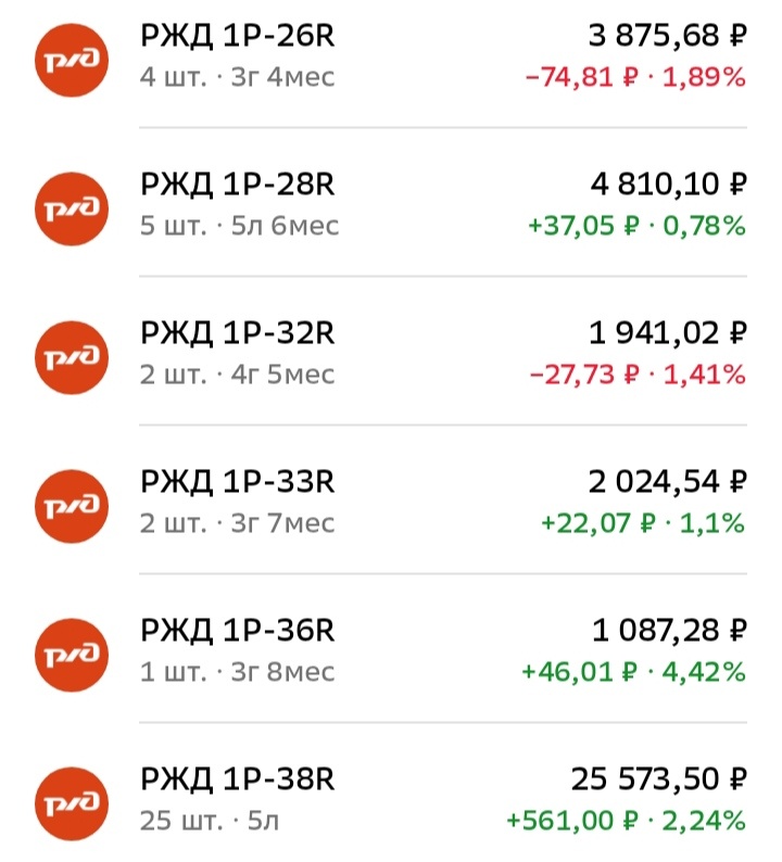Всем привет. У материала, где представила подборку облигаций РЖД в своём портфеле, оказалось немало просмотров. Но на днях поняла, что этой публикации уже год: За этот год многое изменилось, и теперь список облигаций ОАО "РЖД" на моих брокерских счетах выглядит иначе. Решила сделать новую, более актуальную подборку. На данный момент в моём портфеле находится шесть выпусков облигаций РЖД. Из них четыре - флоатеры и два - с постоянным купоном (все с ежемесячными выплатами). В основном, это новые выпуски. Всего 39 штук. Теперь рассмотрим отдельные бумаги более подробно. 1. Облигация РЖД 1Р-26R (флоатер). Плавающий купон, периодичность выплат - 31 день. Размер следующего купона - 18,7 рублей. На данный момент купонная доходность составляет 22,02%. Выплачено 19 купонов из 59. Погашение - 19 июля 2028 (ещё 3 года 4 месяца). Торгуется ниже номинала - на закрытии вчера стоила 964,7 рубля; в портфеле в минусе, но не критично. Флоатер РЖД 1Р-27R был (продала прошлым летом, докупая акции). 2. РЖД