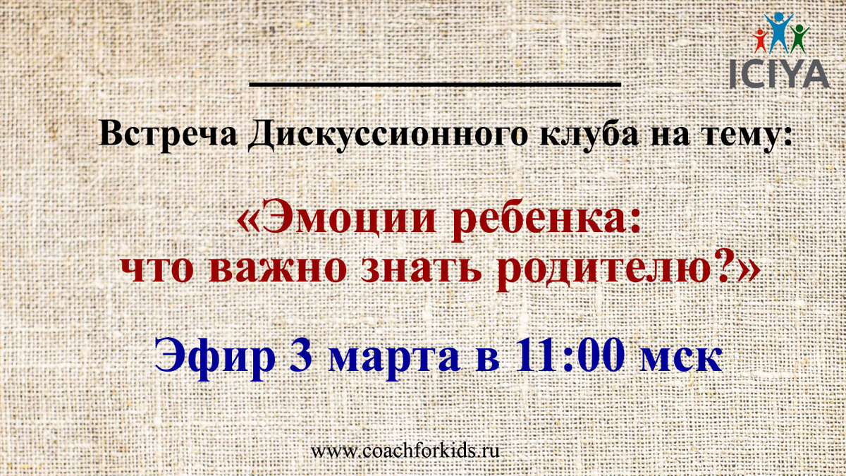 «Он неуправляем, я начинаю говорить ему, а он в крик!» «Я не могу вытащить из него ни слова…» «Не понимаю, как с ней разговаривать.» «Уже несколько раз повторяла – не помогает!» «Друзей нет, ни с кем не общается» «Расстроилась и плачет, не знаю, что делать» «Он паникер» «Я с ним не разговариваю» Это – фразы взрослых, которые связаны с вопросами эмоционального состояния ребенка или подростка. Как взрослому действовать и что сказать ребенку, когда он находится в эмоции грусти, радости, злости, гнева, печали, веселья, когда он боится чего-нибудь? Как успокоить, поддержать, что предпринять, с кем посоветоваться? Приглашаем всех желающих на дискуссионный клуб на тему «Эмоции ребенка: что важно знать родителю?», который пройдет 3 марта в 11:00 по московскому времени в зуме и нашей группе ВК! На дискуссионном клубе разберем ситуации, когда родитель, учитель, воспитатель и любой взрослый не понимает, как вести себя с ребенком в разных эмоциональных состояниях и ситуациях. Если у вас есть вопро