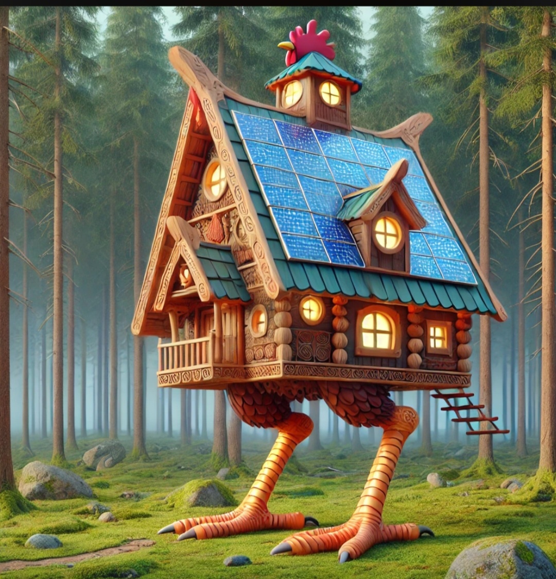 На окраине древнего леса, где тропинки петляют между вековыми дубами и соснами, а грибы растут размером с табуретку, стоит необычный дом. Он не прижат к земле фундаментом, как обычные жилища, а гордо возвышается на массивных курьих ножках – мускулистых, с острыми когтями, которые при ходьбе оставляют в земле глубокие следы.