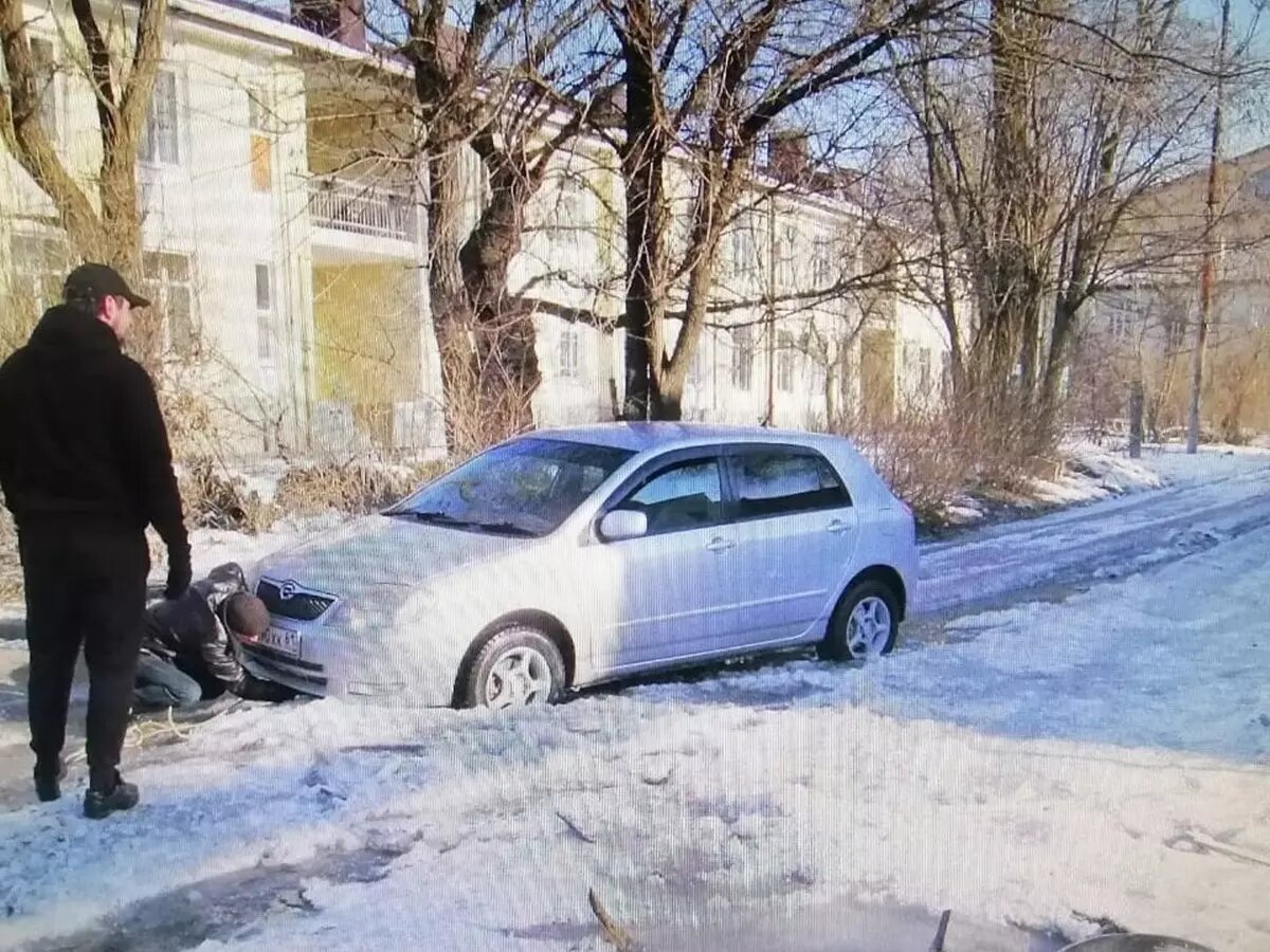 По словам местных жителей, коммунальная авария произошла еще неделю назад. Водой залило всю дорогу. Из-за низкой температуры воздуха на проезжей части появились ледяные ухабины, в которых легковушки увязли колесами.
