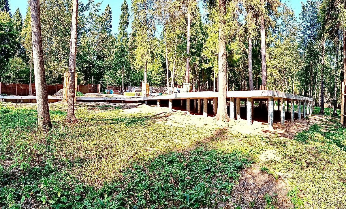 Участок был с довольно большим перепадом высот — около 2 метров, и на нем росло много хвойных деревьев, которые заказчик хотел сохранить. Фундамент площадью 450 м². Мы использовали фундамент ТИСЭ с монолитным перекрытием и парапетом. Сваи были длиной 1,7 метра, а их было 107 штук. Срок строительства составил два месяца с середины июля по сентябрь 2024 года. Что интересно, изначально планировали монолитный ростверк, но с таким перепадом высот это было бы неудобно, потому что было трудно гарантировать правильное положение свай. Поэтому выбрали свайную технологию ТИСЭ, которая позволяет гибко подкорректировать геометрию. Кроме того, заказчик хотел сделать утепление под перекрытием и установить подвенечный парапет. Вопрос с опалубкой тоже решился интересно: мы комбинировали несколько вариантов — песчаную засыпку, обрезную доску и инвентарную опалубку. Все работы прошли спокойно, без сюрпризов, а деревья остались на своем месте. Подрядчик, который строит дом из CLT-панелей, фундамент приня
