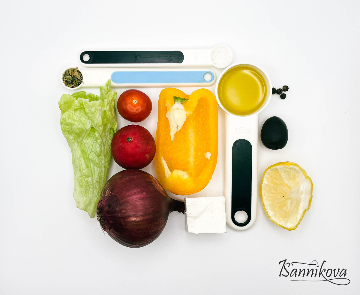 1. листья салата порезать (произвольно), красный лук кольцами, желтый перец — соломкой, фету измельчить (можно руками), редис порезать слайсами, маслины и черри — пополам, чеснок натереть на мелкой терке/чеснокодавилка