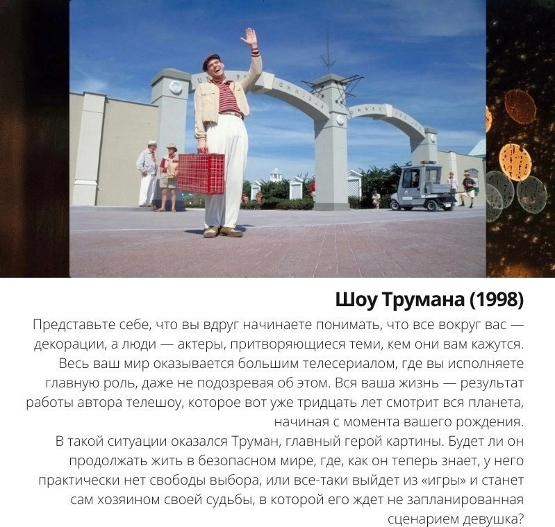 Как вовремя все жизни к нам приходит, Я удивляюсь этому и каждый раз, Когда Господь о главном мне напомнит, То слезы катятся из глаз.. Вот так сегодня, в этот самый вечер, Когда из жизни почти вышел страх, Что без системы, словно ты увечен, «Перестрахуй себя и будь по жизни раб», Прекрасный фильм стал мною вдруг замечен.. Вы скажите, что это все пустяк! Что Шоу Трумана смотрели все и каждый, Да может быть и так, Но для меня сейчас период важный, И Бог решил убрать весь кавардак.. Послал вот эту мне картину, Где замысел пред нами наг, Где четко показали, как рутину, Покинул тот, кто кажется дурак.. Как Счастливо покинул он все стены, Манипуляций, фобий, врак, Когда проснулись Истинной Свободы гены, Когда он самому себе уже не враг.. Тогда мы видим - море по колено, И он уже возле заветных врат, И может это не простые перемены, Но главное - он безконечно Рад! Татьяна Беспалова Всем привет, Друзья!!! Не перестаю удивляться тому, как